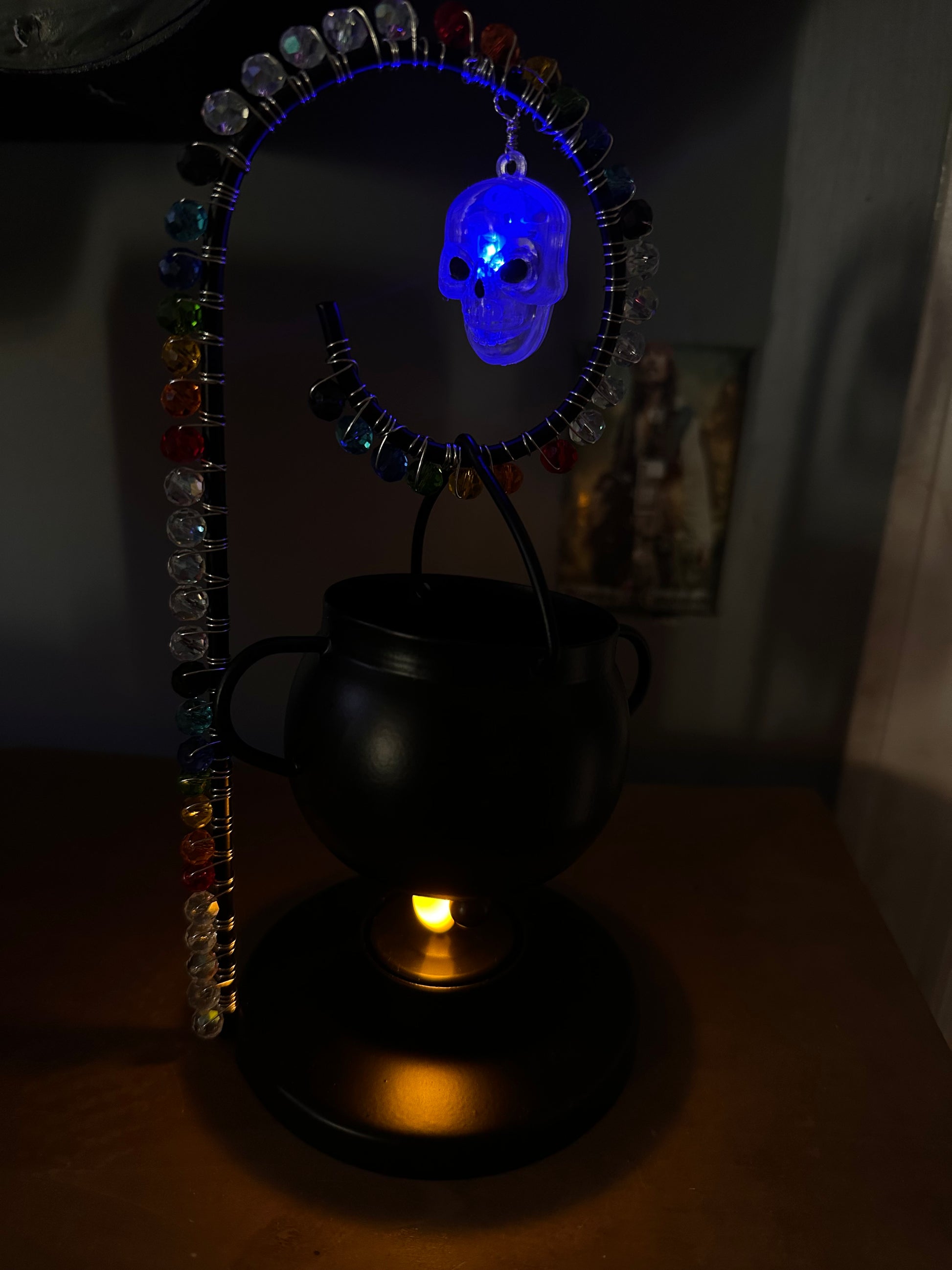 A black cauldron rests beneath a spiral of hand-wrapped rainbow glass crystals, each one scattering tiny rainbows across your space. Above it hangs a glowing blue skull charm, casting an otherworldly light that dances like fire in the dark. When the season fades, you can swap it for the included clear crystal prism or any future charm from the collection.