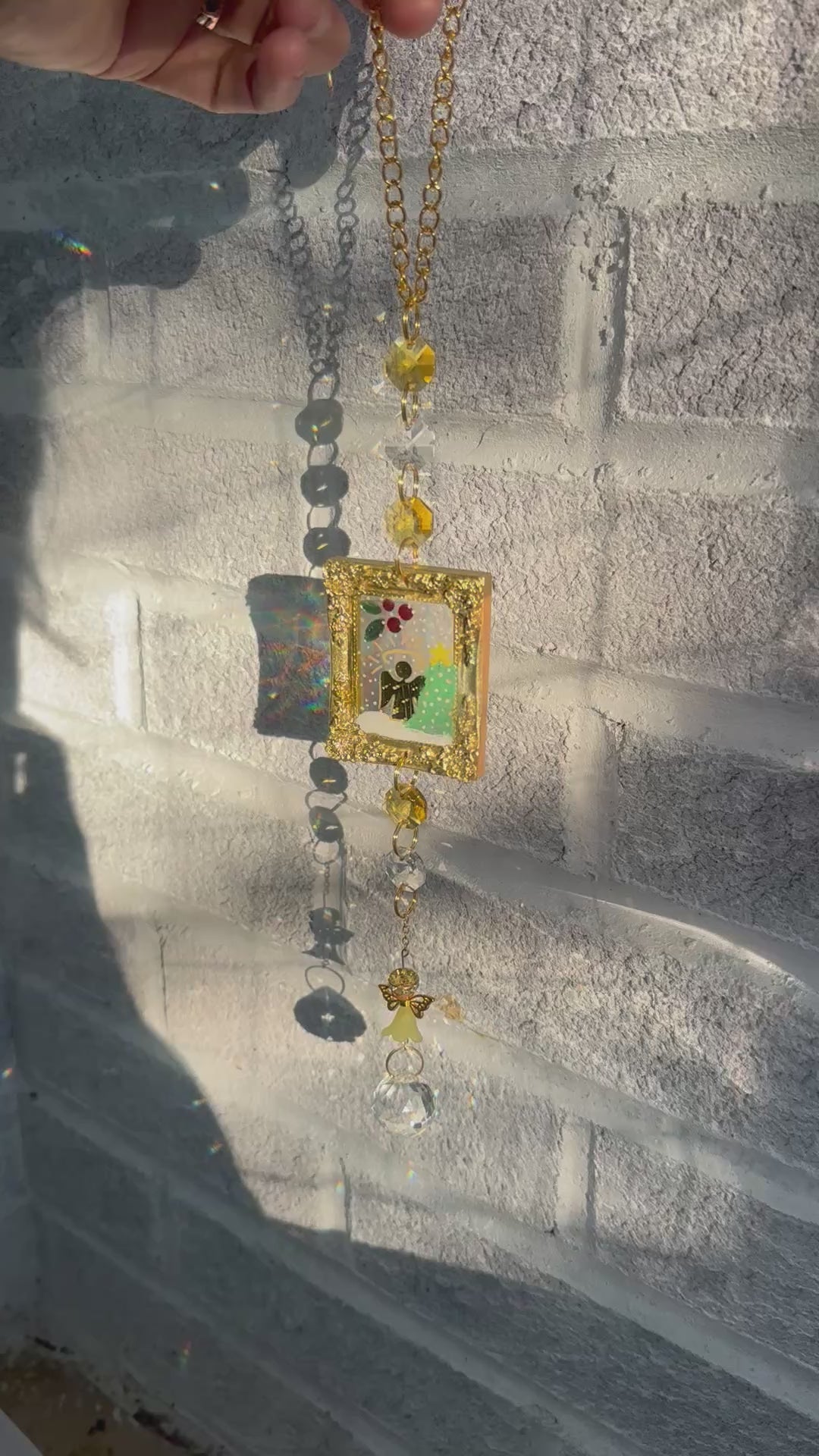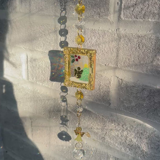 An angel sits beside a tiny hand painted Christmas tree, glowing with the warmth of the season, reminding you that even during the holidays, you are being lovingly watched over. Each crystal catches the light and sends gentle rainbows, a promise that you are never alone.