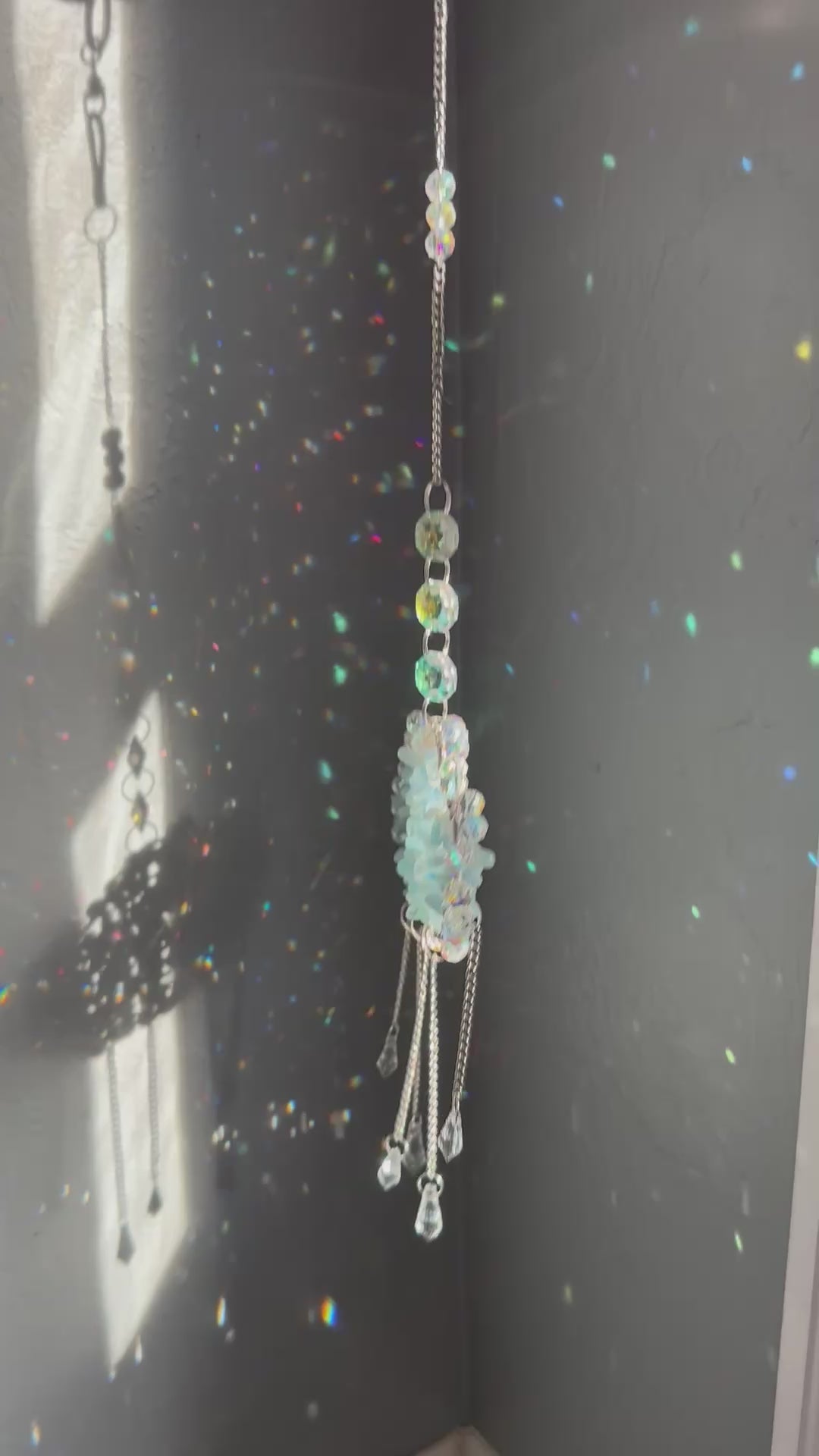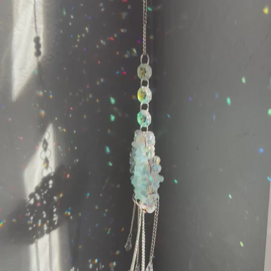 This handmade rain cloud suncatcher measures approximately five inches wide, three inches tall, and nineteen inches from the top of the chain to the bottom crystal drop. It is created with real aquamarine crystal chips and tiny glass raindrops that shimmer like a soft summer shower. The cloud carries a soft touch of blue and brings a calming brightness to any window. Aquamarine is often associated with tranquility, courage, and clarity, making this piece a soothing reminder for any space.