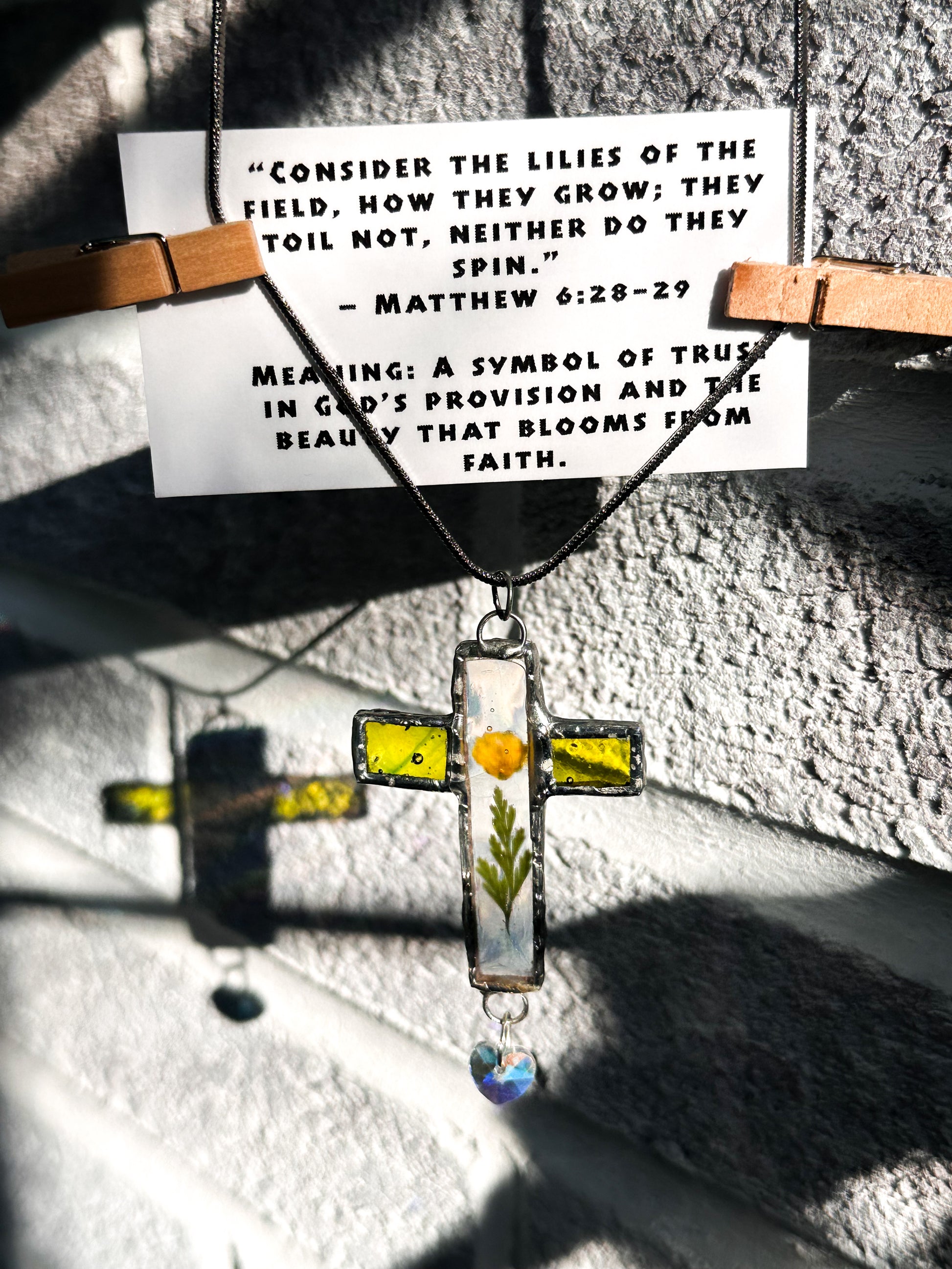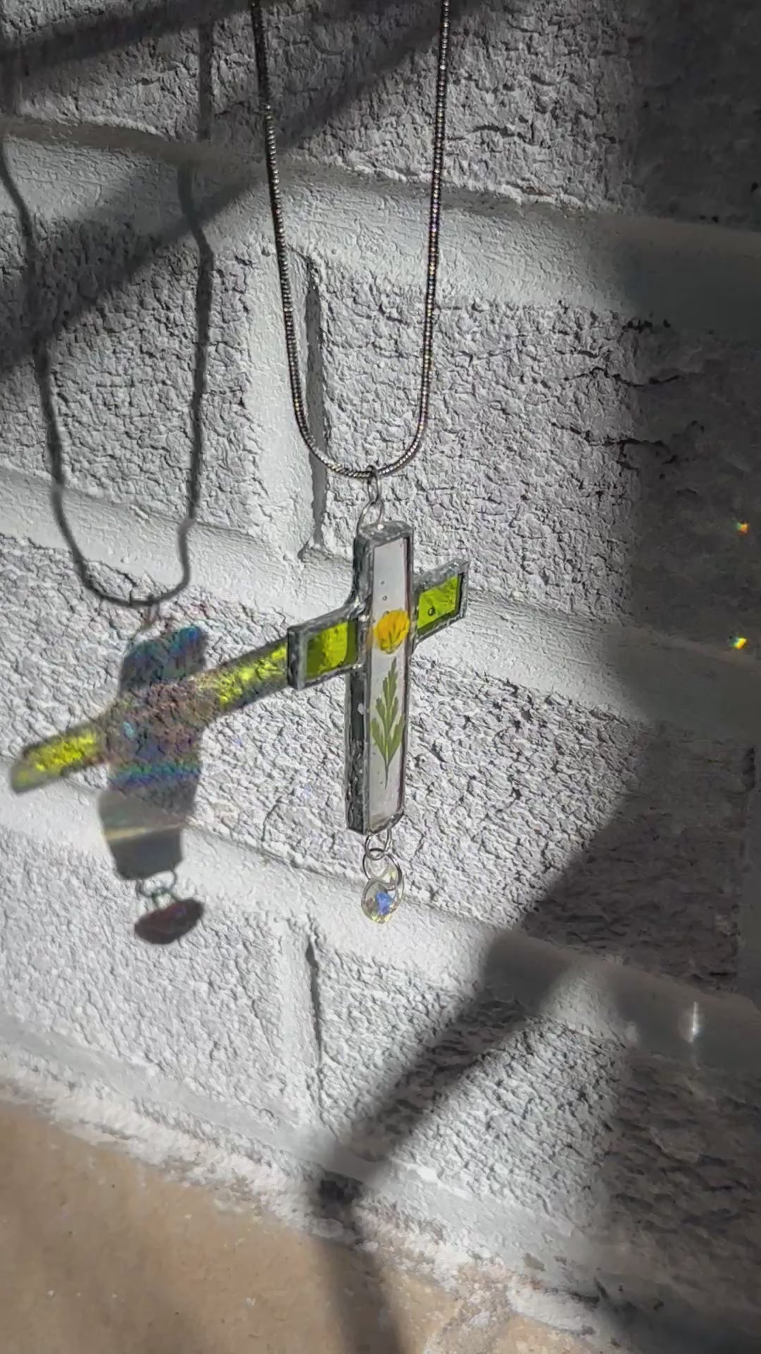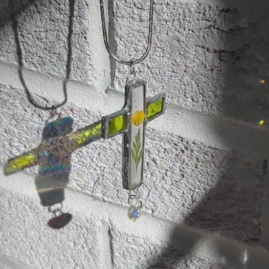 This stained glass cross measures just over 2 inches tall and about 1.5 inches wide. A real yellow flower is preserved in clear resin at the center, surrounded by glowing yellow glass arms. A small heart-shaped crystal hangs at the bottom, scattering rainbows. I also seal the back with a layer of resin that creates a holographic rainbow effect, making the light even more special when it shines through.