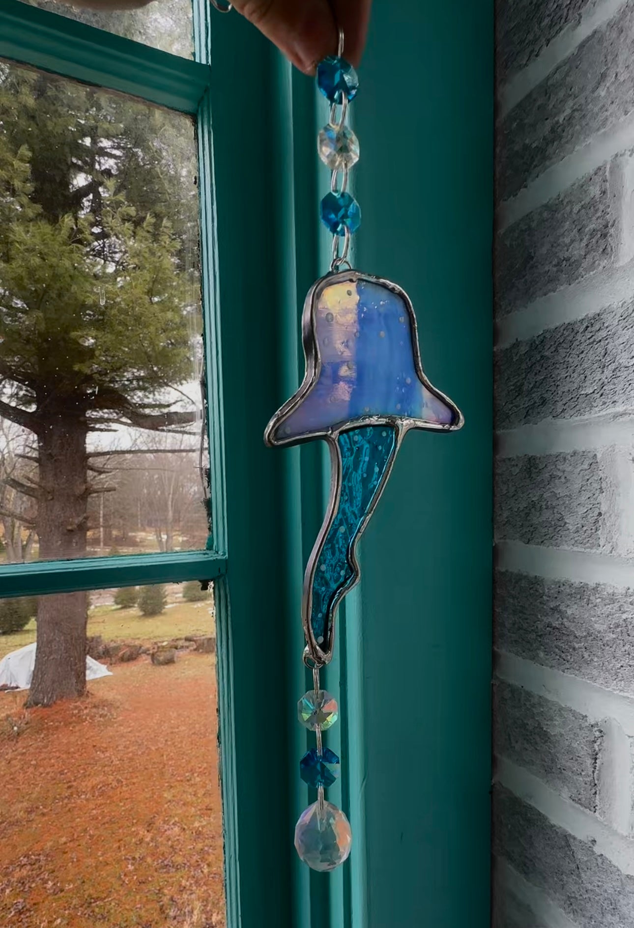 As the light moves through the glass, cool blues and subtle reflections are cast into the surrounding space. Each piece is cut, wrapped, soldered, painted, and finished entirely by hand. Natural variations in glass texture, color shift, and hand painted details ensure that every suncatcher is one of a kind.