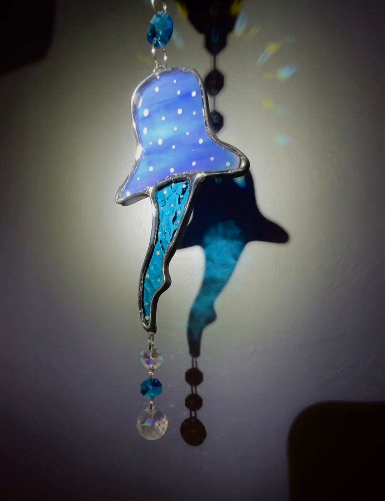 The main body of the whale shark is made from iridescent glass. When sunlight passes through, the glass shifts softly, creating changing light and depth throughout the day. The tail is crafted from water glass, adding movement and texture that mirrors flowing water. Each spot along the body is carefully hand painted, giving the whale shark its own unique character. The entire piece is wrapped in hobby came, creating a smooth, finished edge.