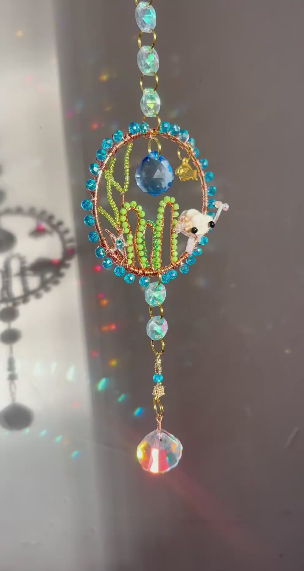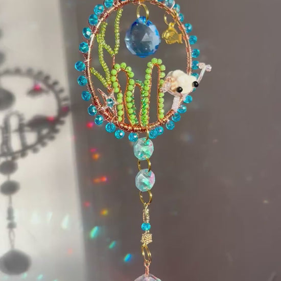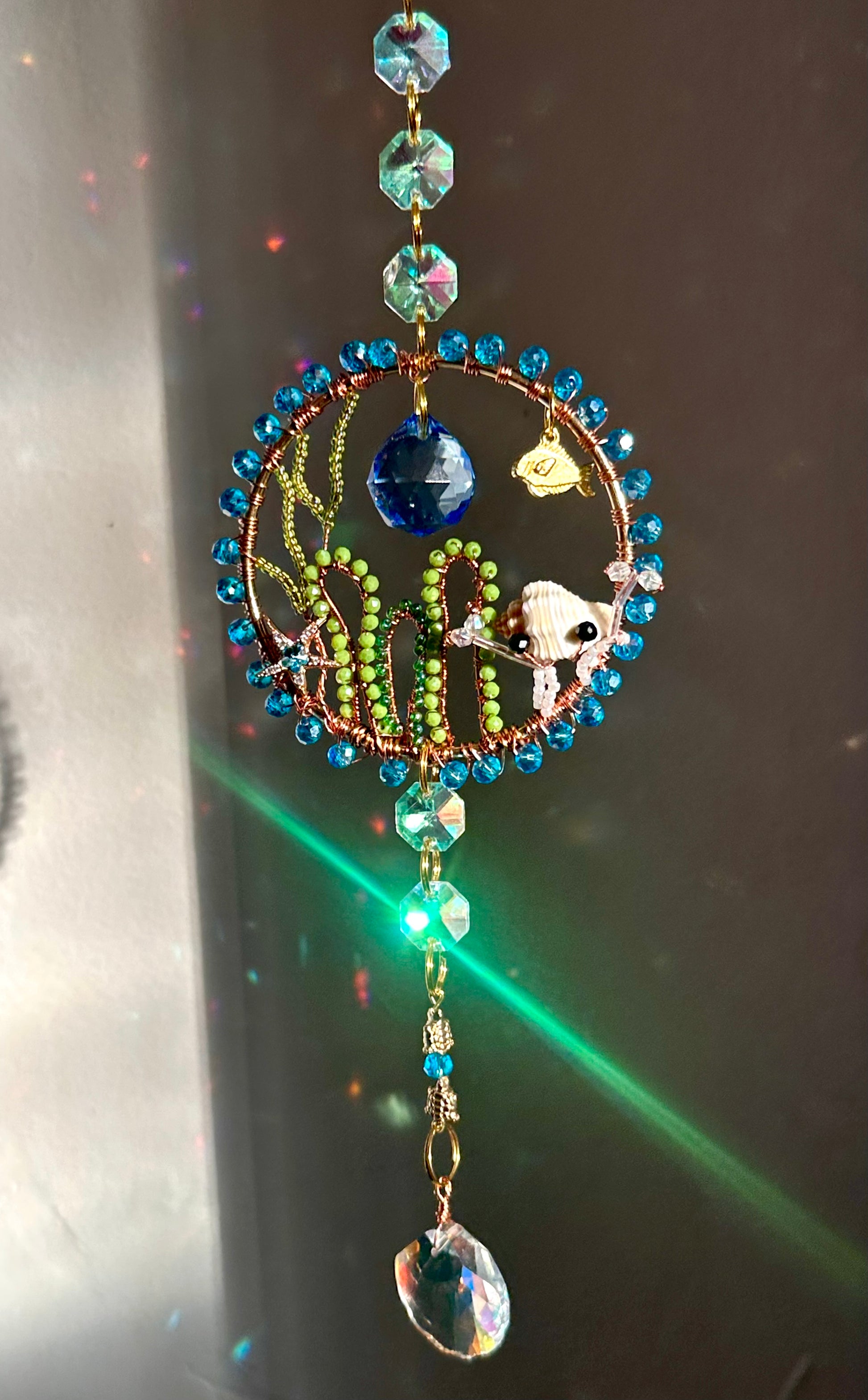 This handmade ocean scene suncatcher is created on a three inch hoop and measures approximately seventeen inches from the top of the chain to the bottom seashell crystal. The underwater landscape is shaped with hand beaded seaweed, a tiny hermit crab, a shimmering starfish charm, and a small fish swimming through the coral. Little golden turtle beads add a touch of whimsy and warmth. The outer edge is wrapped in bright ocean blue beads, and the piece is finished with a large faceted seashell crystal that glows with shifting color when it catches the light.