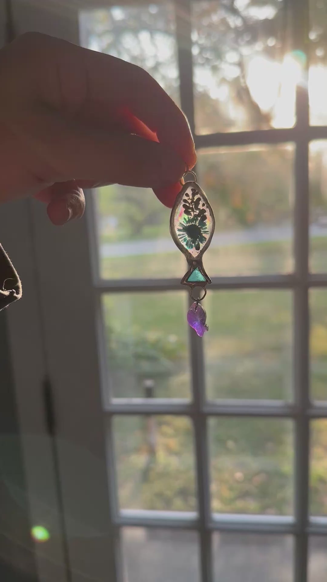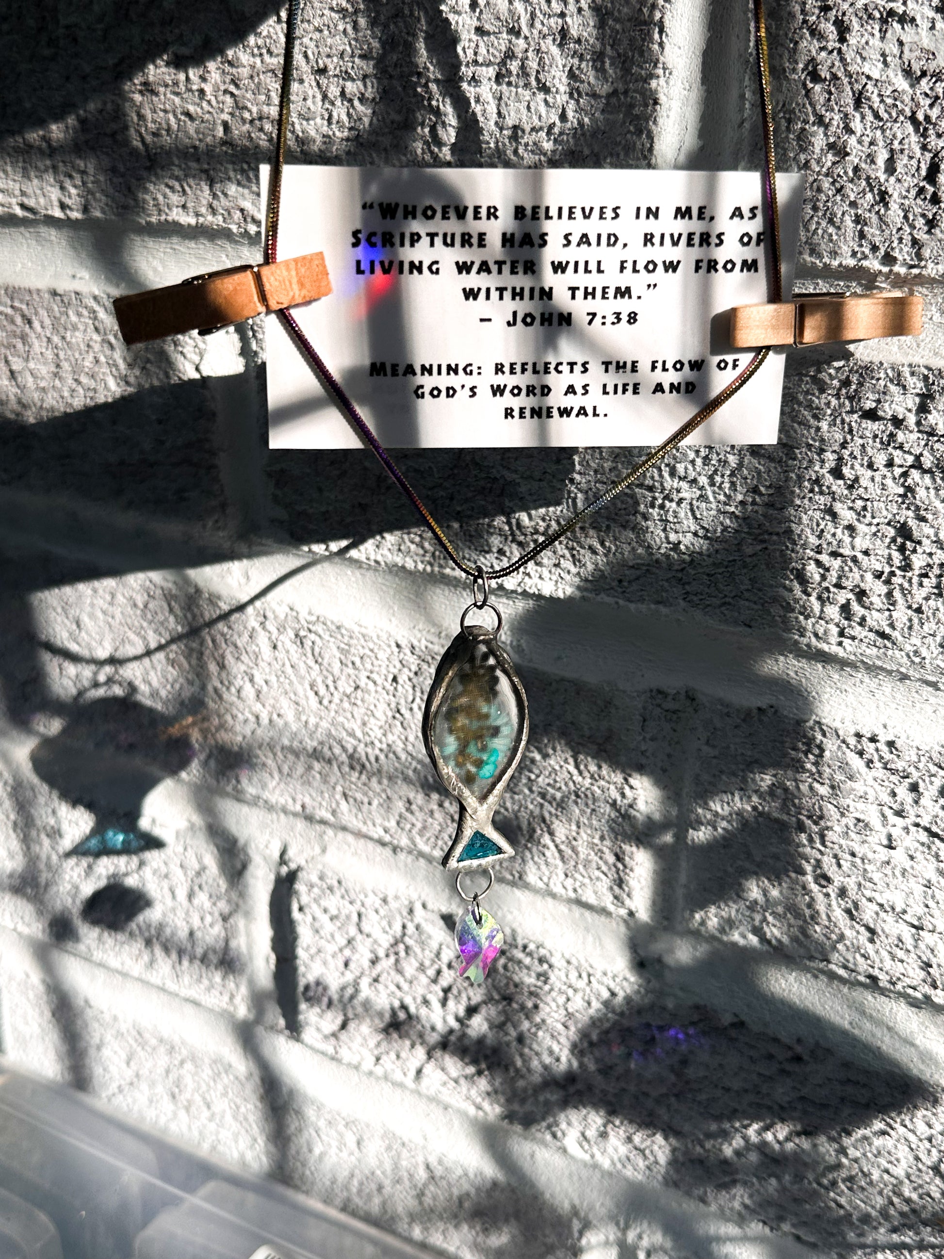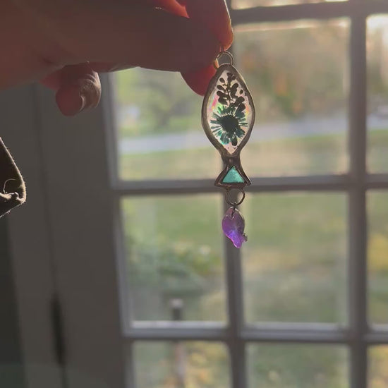 This stained glass fish necklace measures just over 1.5 inches long, a small but meaningful size to wear daily while still catching the light beautifully. A real turquoise colored flower is preserved in resin at the center, symbolizing life, renewal, and God’s constant presence. A shimmering crystal fish hangs below, scattering rainbows in the light. I also seal the back with a layer of resin that creates a holographic rainbow effect, making the light even more special when it shines through.
