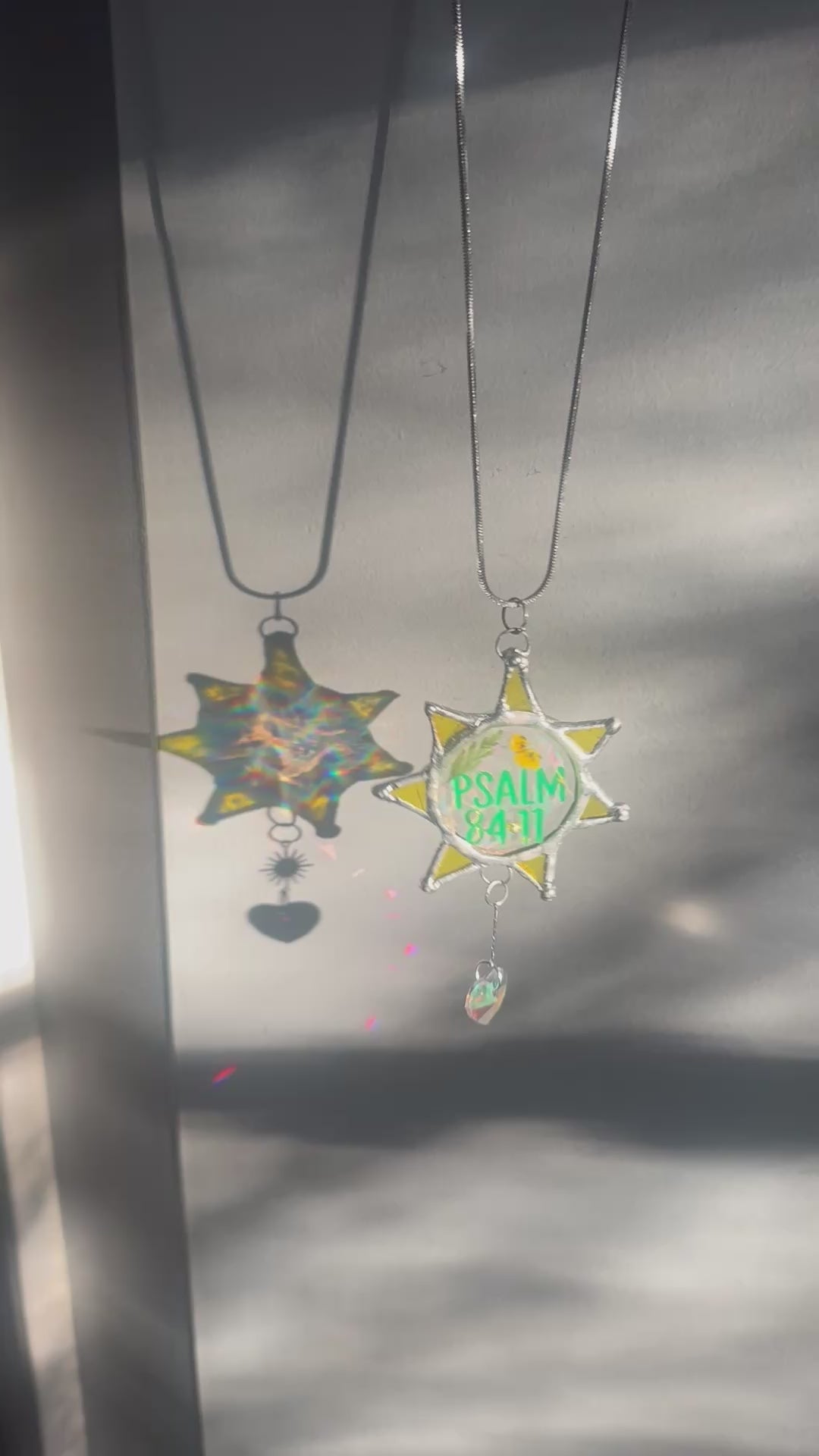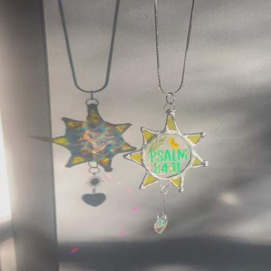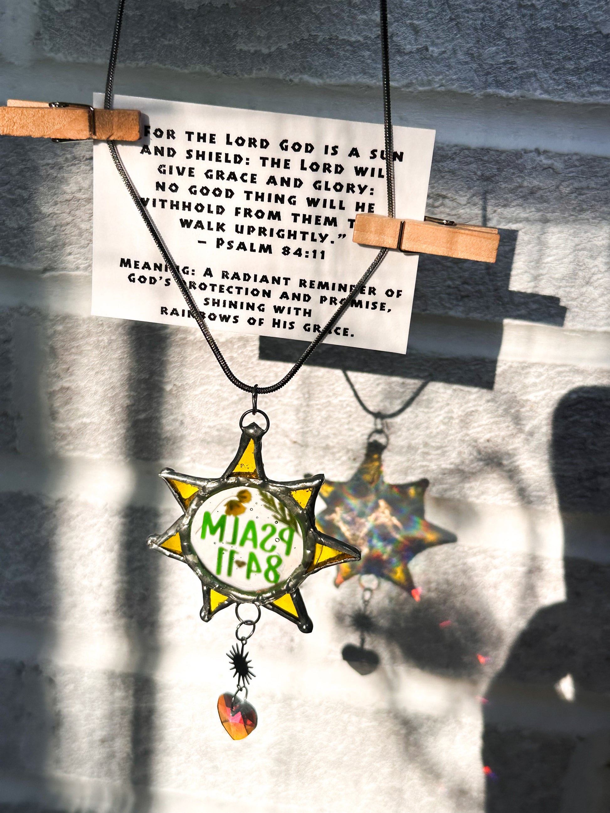 Handmade stained glass necklace measuring about 2 inches by 2 inches. This radiant sun-shaped design features glowing yellow glass, a preserved flower, and the scripture reference Psalm 84:11. A layer of resin with rainbow backing allows it to shimmer with hidden rainbows in the light. Finished with a dangling sun charm and a heart crystal that sparkles as it moves, this piece is a striking reminder of God’s protection and grace.