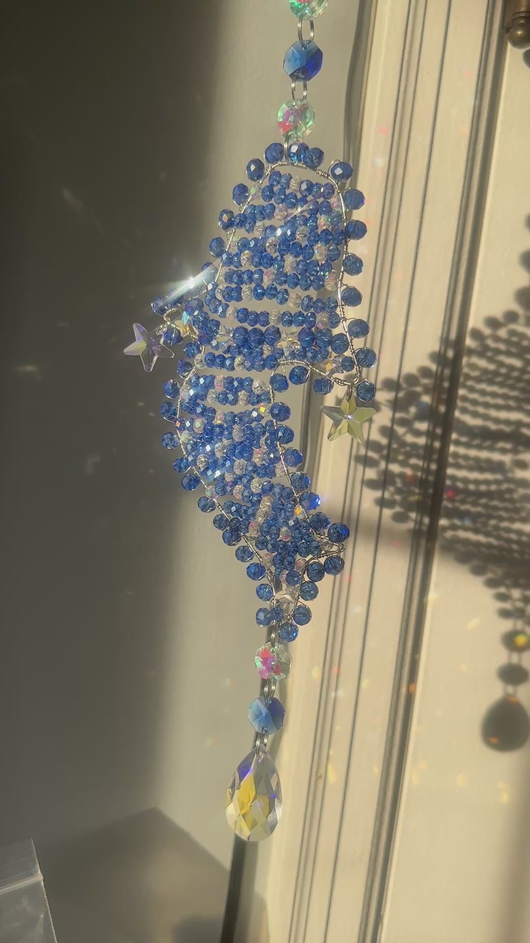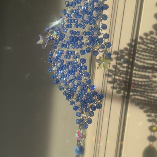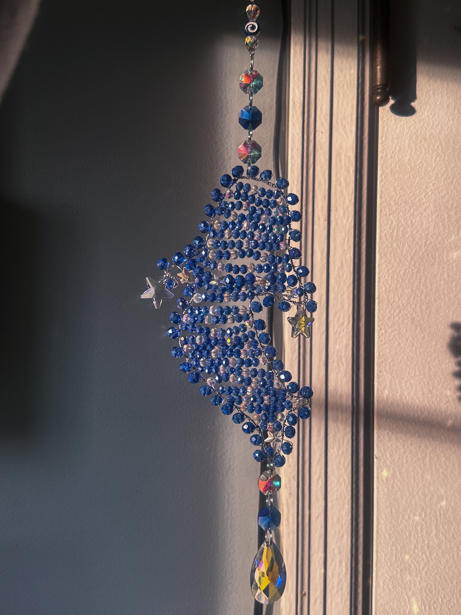 I custom made the frame and soldered it myself, and I only use real glass and crystal beads. Each bead was placed by hand, making this a truly unique ocean-inspired statement piece. Perfect for a sunny window, wall hook, or anywhere you want a little sea magic and light.