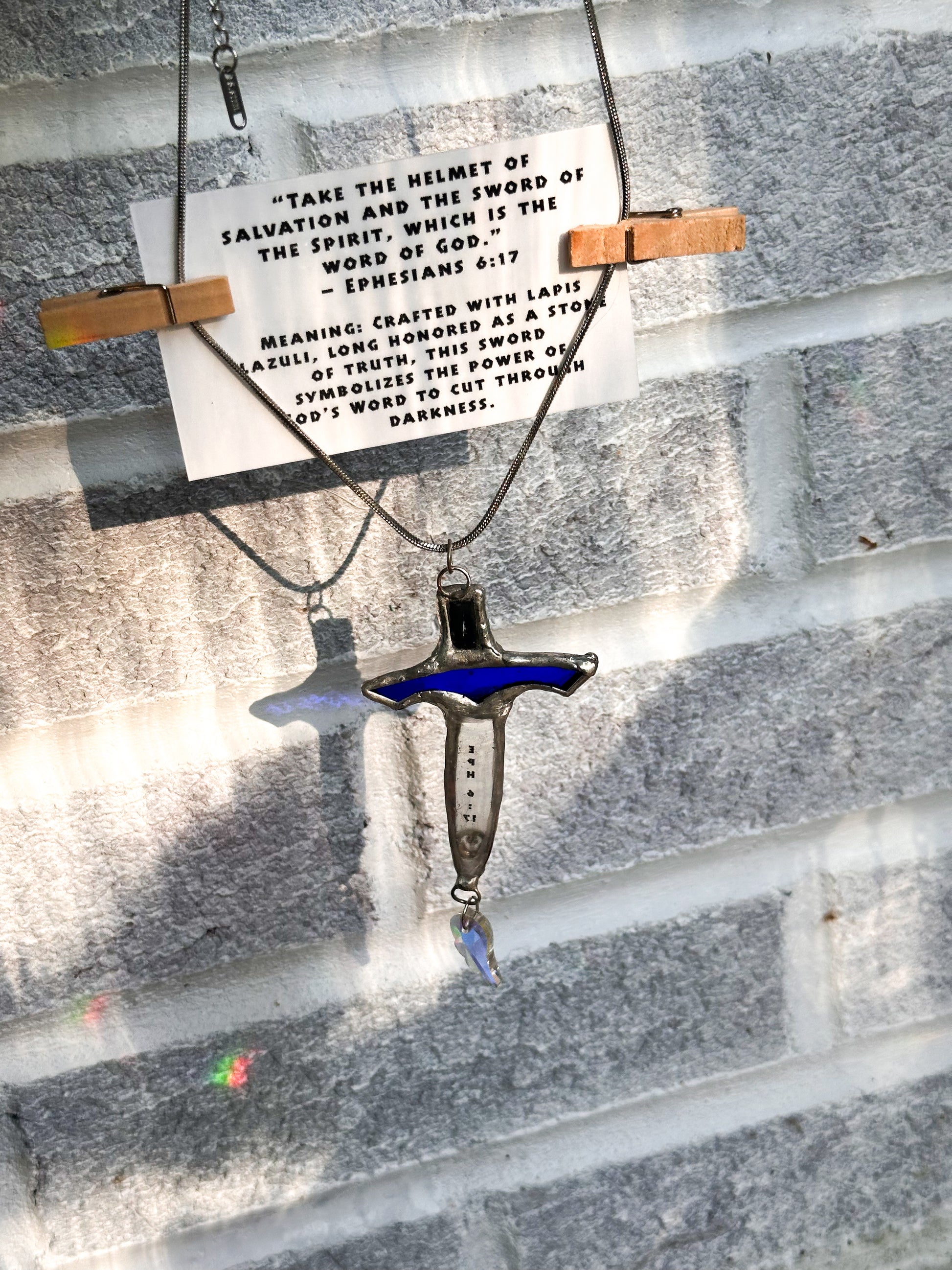 Meaning: The Sword of Truth reminds us that God’s Word is alive and unshakable, cutting through every shadow with the brilliance of His Spirit. The deep blue cross guard reflects steadfast faith, while the rainbow backed blade shines with His promises. The anchor charm symbolizes the hope we hold firm in Christ, grounding us even in life’s storms. The beautiful, sparkling angel wing symbolizes protection. Even with its small imperfections, this piece becomes a living reminder that God’s truth is perfect, even when we are not and His light still shines through every crack and flaw.