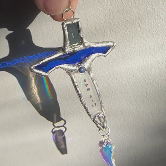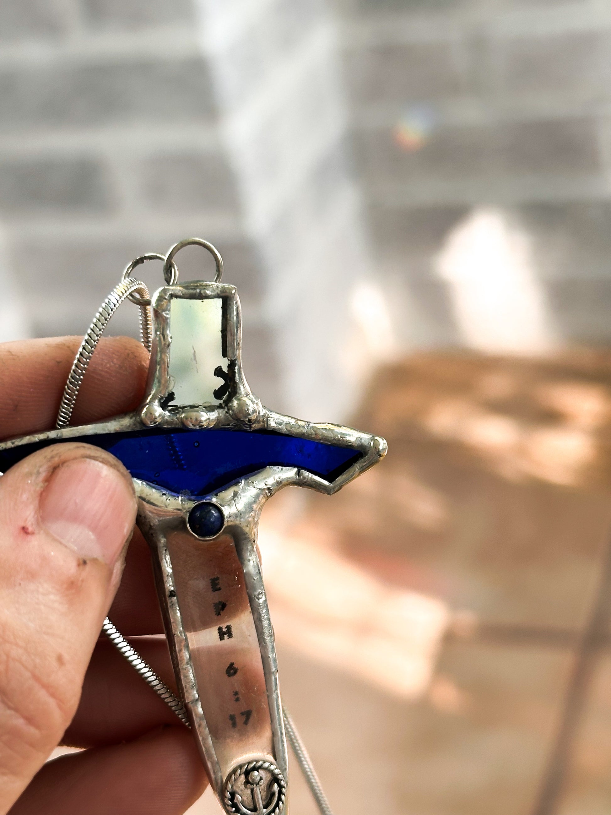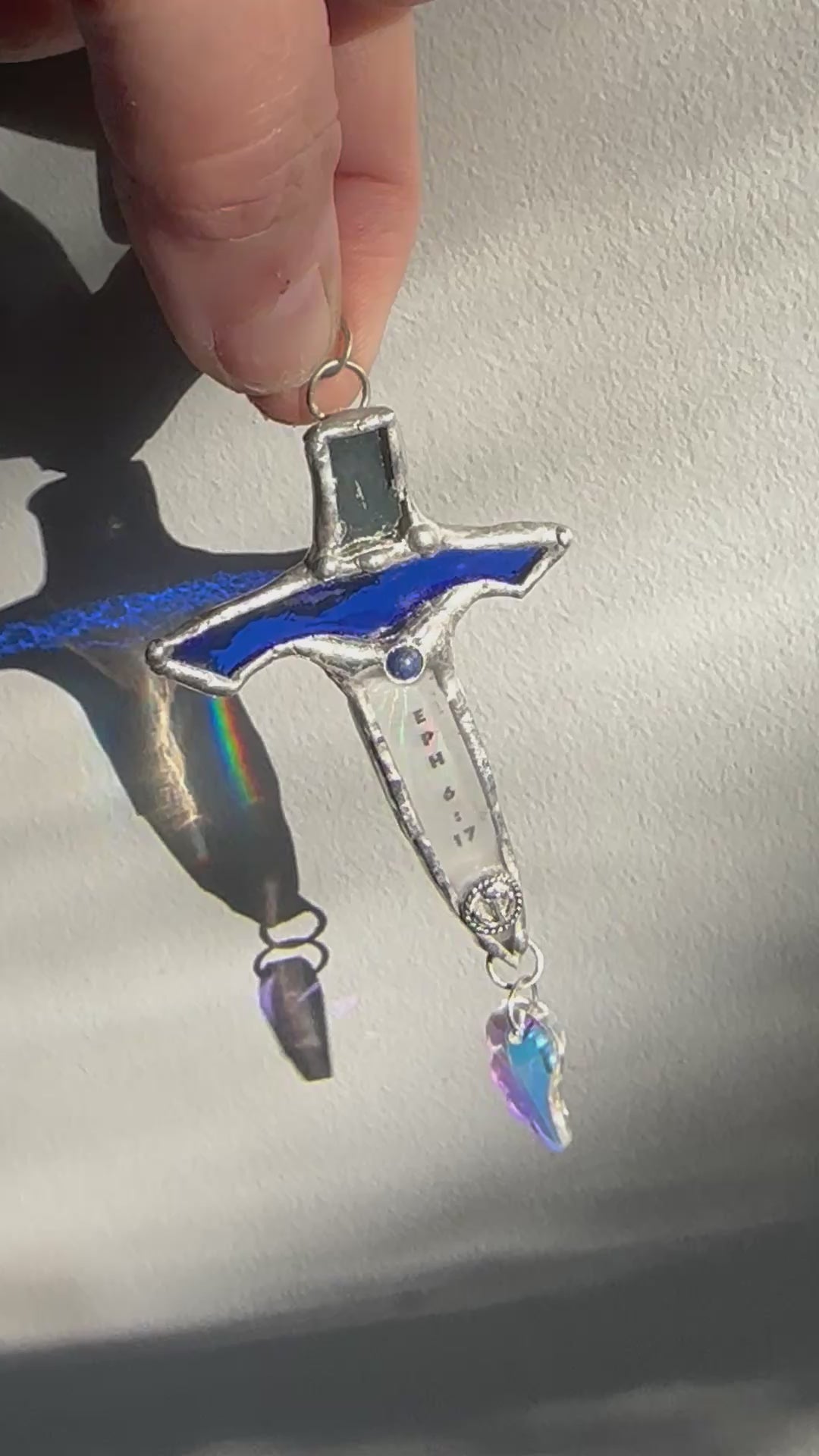 This stained glass sword necklace measures about 3 inches tall and 2 inches wide. The blade is crafted from clear glass with a rainbow resin backing, catching light and shifting reflecting rainbows! Deep blue glass forms the crossguard, accented with a lapis lazuli stone, while the handle was made with mirror glass. An anchor charm is sealed in the blade, symbolizing steadfast hope and unwavering faith. A sparkling Wing Crystal dangles symbolizing, protection. Please note: the mirror handle has chips under the resin seal and the solder line is chipped so this piece is being offered at a clearance price.