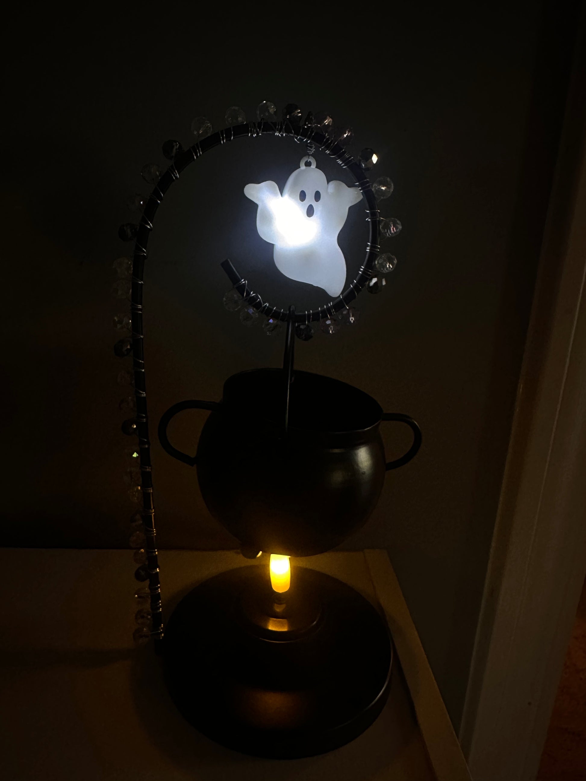 A black cauldron rests beneath a swirl of hand-wrapped beads, featuring shimmering purple and clear crystals that glisten like twilight air. Above it floats a glowing light-up ghost charm, shining softly as if whispering stories from beyond. When the season fades, you can swap it for the included lavender crystal prism or any future charm from the collection.