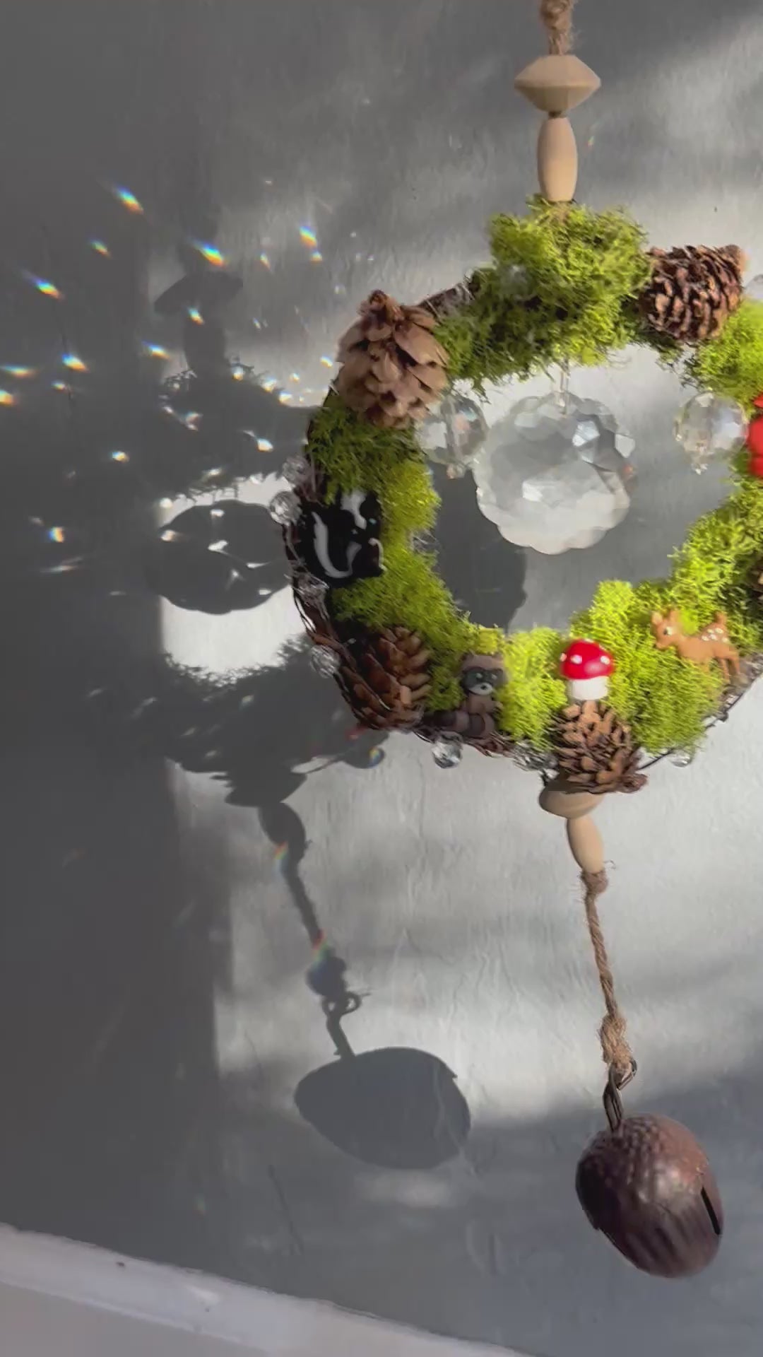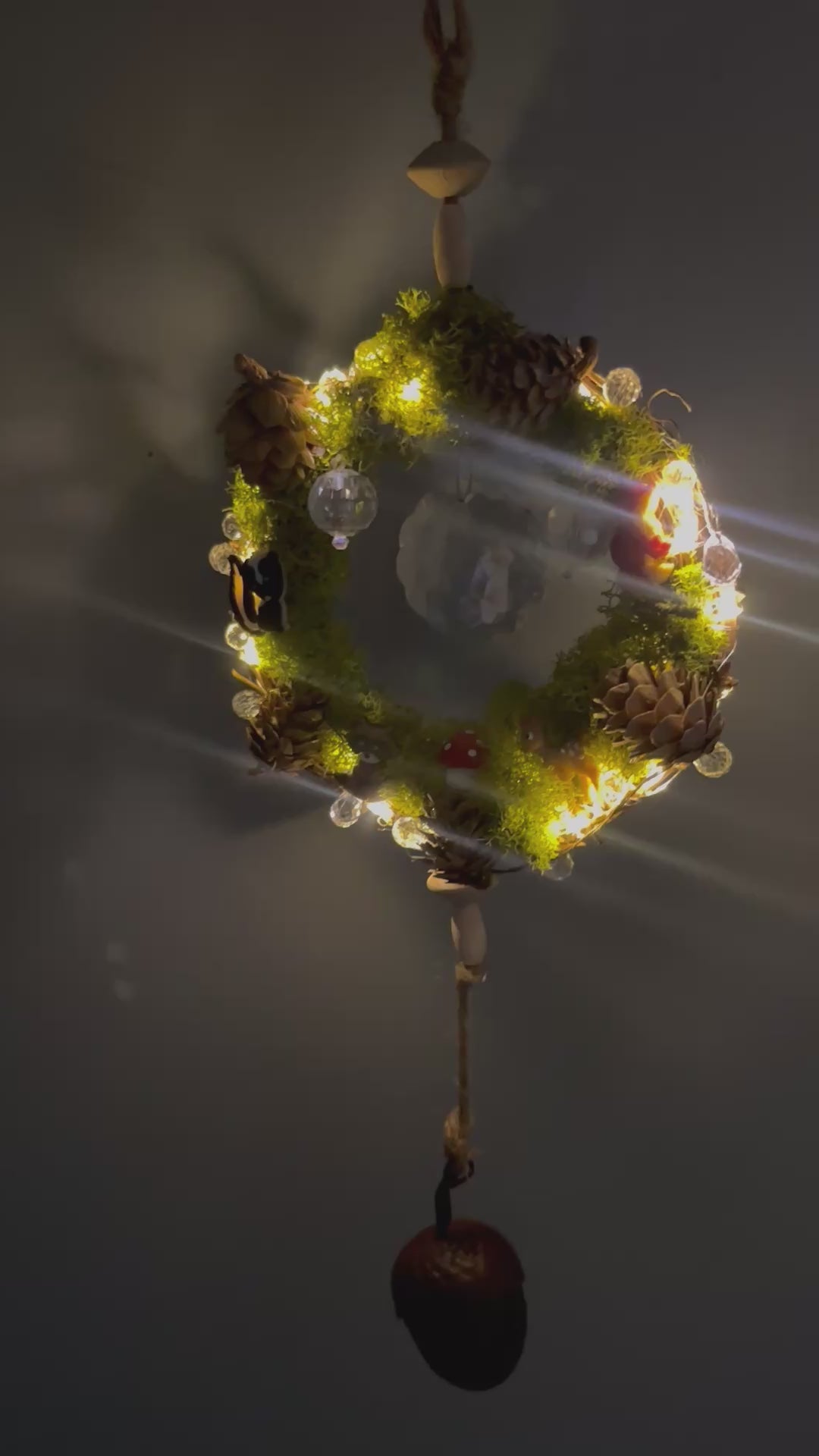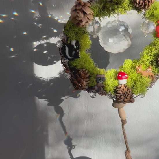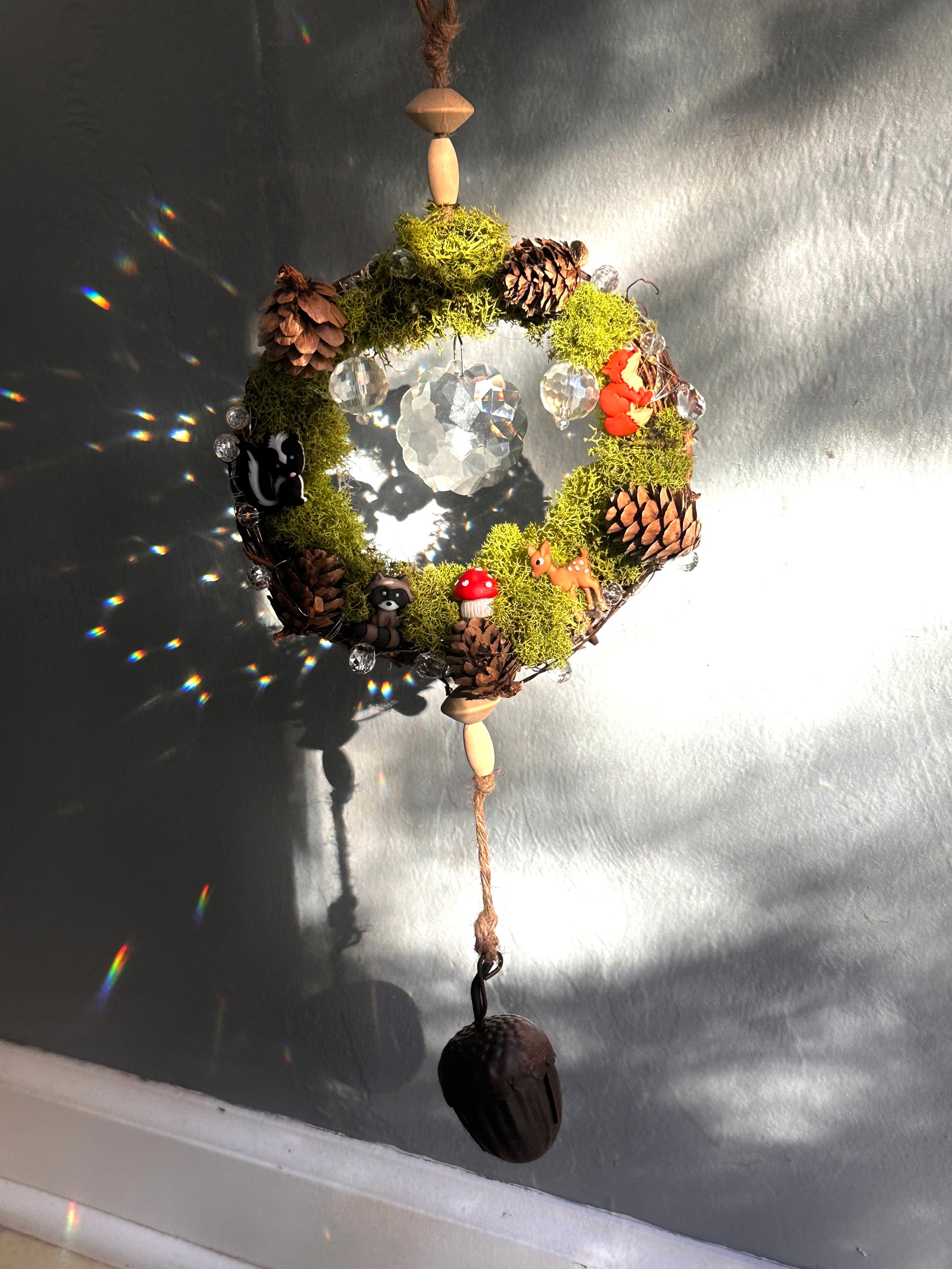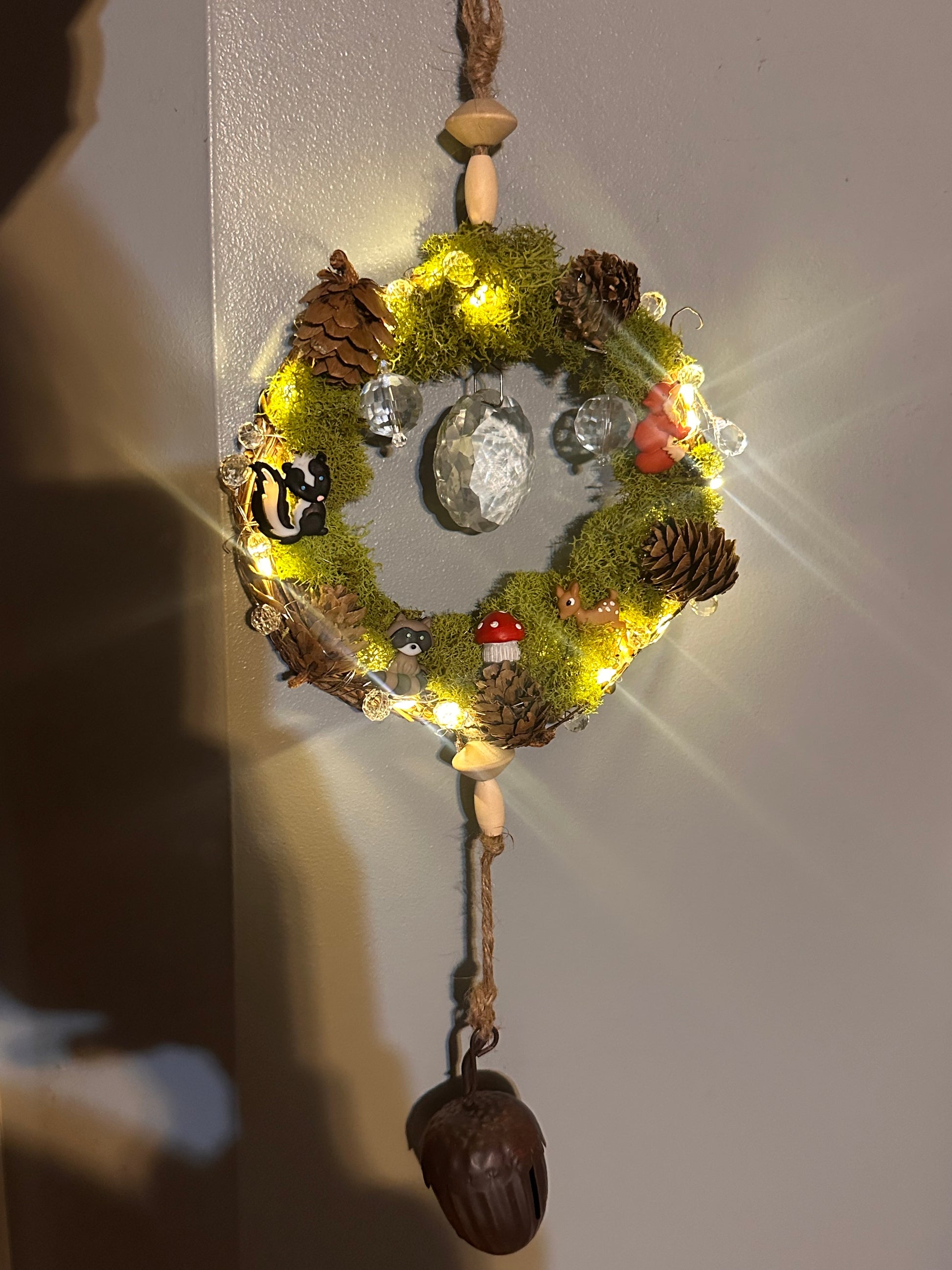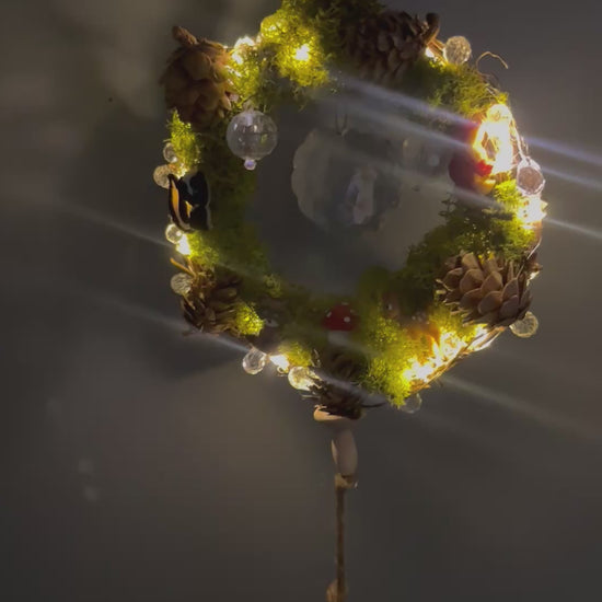 A wreath of moss cradles a world of magic. Tiny woodland souls rest among crystals and pinecones, their quiet joy reflected in every shimmer. The acorn bell below carries their song, a gentle reminder that even the smallest corners of nature are filled with wonder and life.